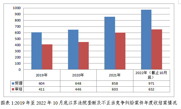 2019年至2022年10月底,江苏法院共受理各类不正当竞争纠纷3068件,年均增长23.02%,审结2107件,年均增长25.24%;受理垄断纠纷13件,审结5件。