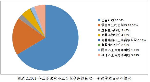 1.从案件类型来看,仿冒纠纷、侵害商业秘密纠纷占绝对比例。以2021年为例,全省法院新收的557件一审不正当竞争纠纷中,这两类纠纷占84%。其中,仿冒纠纷375件,占66%,侵害商业秘密纠纷105件,占18%。同时,不正当竞争与商标侵权混合侵权纠纷占比较大。2019-2021年审结的一审不正当竞争纠纷案中,有459件涉及其他案由,占结案数的31.44%,其中侵害商标权及不正当竞争纠纷413件。
