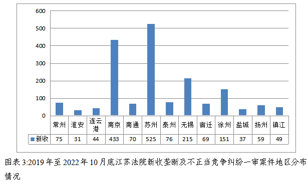 2.从地区分布来看,纠纷相对集中于苏州、南京、无锡、徐州四地。全省新收一审垄断及不正当竞争案件超七成发生在上述地区。